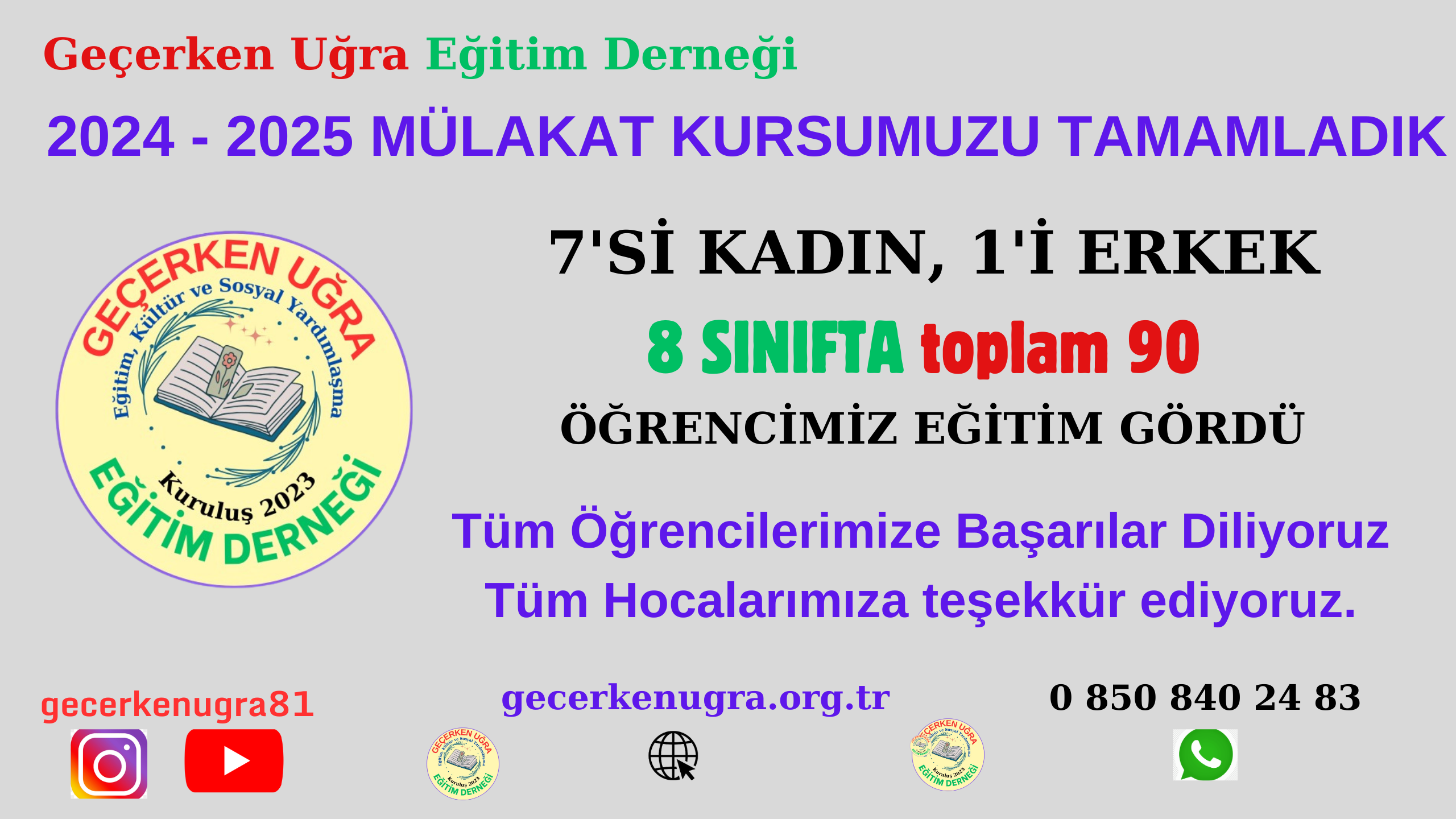 2024 - 2025 Yılı 100 günlük Mülakat Kursumuzu tamamladık. 7’si Kadın 1’i Erkek 8 sınıfımızda toplamda 90 öğrencimiz eğitim gördü.