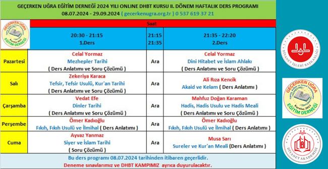 GEÇERKEN UĞRA EĞİTİM DERNEĞİ 2024 YILI ONLINE DHBT KURSU II. DÖNEM HAFTALIK DERS PROGRAMI