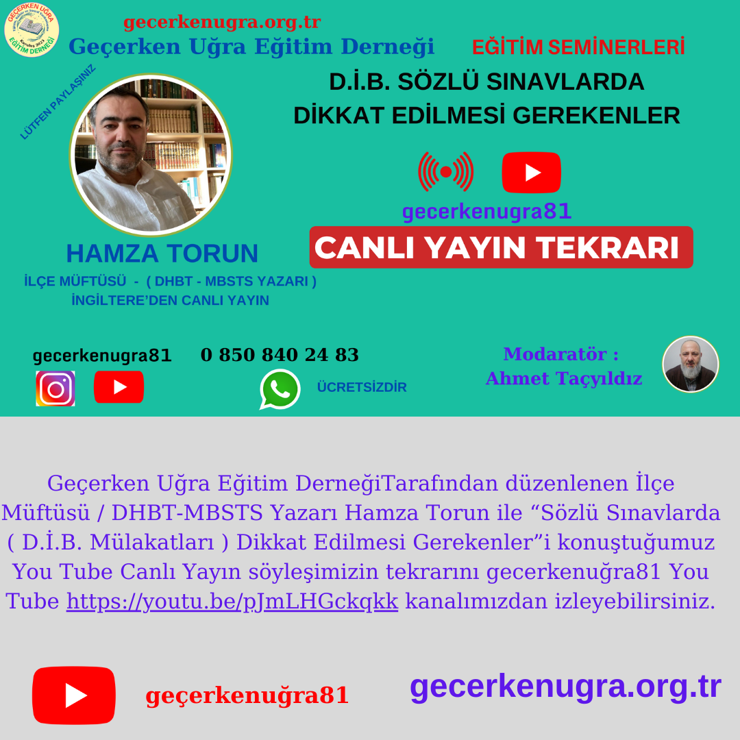 Geçerken Uğra Eğitim DerneğiTarafından düzenlenen İlçe Müftüsü / DHBT-MBSTS Yazarı Hamza Torun ile “Sözlü Sınavlarda ( D.İ.B. Mülakatları ) Dikkat Edilmesi Gerekenler”i konuştuğumuz You Tube Canlı Yayın söyleşimizin tekrarını gecerkenuğra81 You Tube https://youtu.be/pJmLHGckqkk kanalımızdan izleyebi