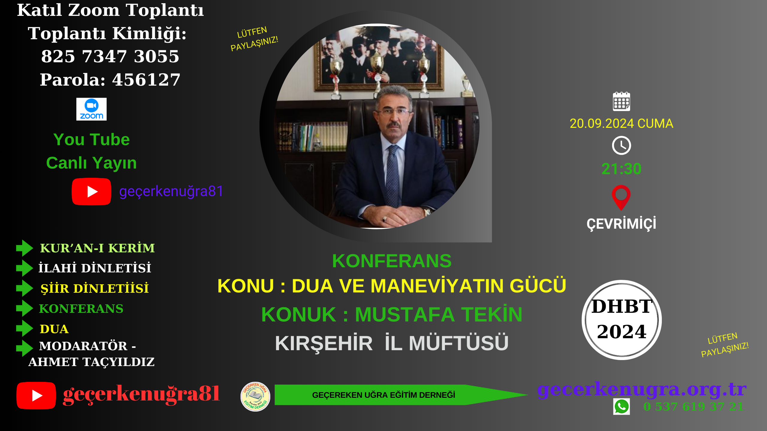 KIRŞEHİR İL MÜFTÜSÜ MUSTAFA TEKİN HOCAMIZIN KONUŞMACI OLARAK KATILDIĞI, İLAHİ VE ŞİİR DİNLETİLERİ İLE RENKLENDİRECEĞİMİZ “DUA VE MANEVİYATIN GÜCÜ “ KONULU KONFERANS VE DUA PROGRAMINA BEKLİYORUZ.