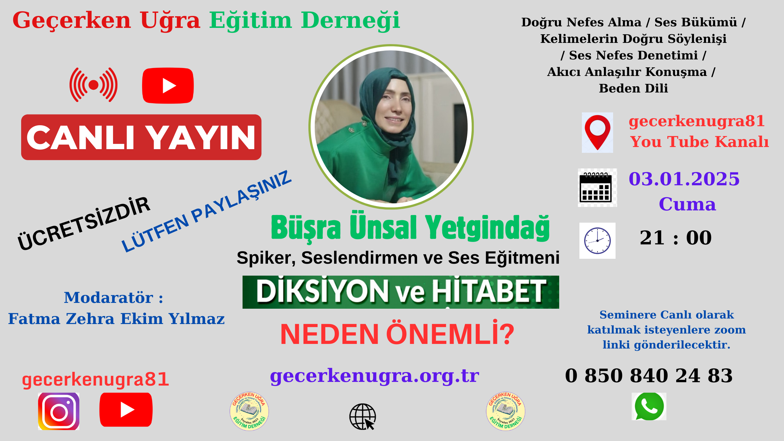 Spiker, Seslendirmen ve Ses Eğitmeni Büşra Ünsal Yetkindağ İle "DİKSİYON VE HİTABET'İN NEDEN ÖNEMLİ" olduğunu konuşacağımız söyleşi tarzında seminerimize bekliyoruz. 03.02.2025 Cuma günü Saat 21:00'da gecerkenugra81 You Tube kanalımızda canlı yayın ile sizlerle.